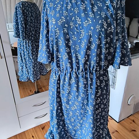 Hyväkuntoinen musta mekko, jossa pieniä valkoisia kukkia. Takana vetoketju. Säädettävät olkaimet. Kangas joustaa vähän.