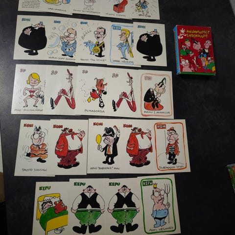 Korteissa 4 puoluetta, KEPU, SD, KOK, KOM, jokaisessa 5 korttia; kehystetty pääehdokas, 2 muuta poliitikkoa sekä 2 Karin piirtämää puolueiden tunnushahmoa.