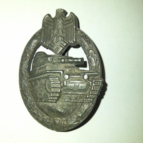 Panssarintorjunta merkki, aitoudesta ei tietoa, mutta patinan perusteella on vanha, hakaskiinnitys