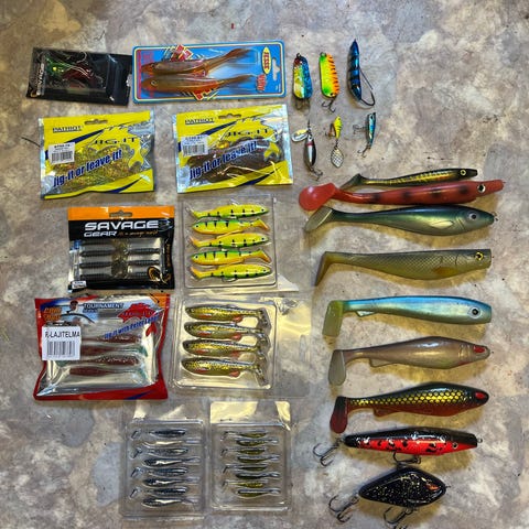Kalastustarvikkeita Berkley BowerBait kalastus syöttejä, purkit vajaita kaikkia on käytetty, muovitoukkia, koukkuja.
