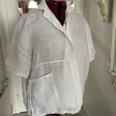 Ulla Popken pellava / puuvilla pleiseri valkoinen. Kaikai 70 olka/ helma 85. Hihat ovat hiukan läpinäkyvät, siis ohuempaa kangasta ilman vuorta. Pituutta voi säätää kääntämällä hihan suuta, jossa pienet hakit. Pituus normaalilla kääneteellä. 55cm
