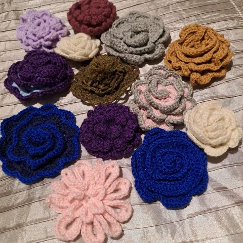 Virkatun kukan halkaisija on n. 9 cm, hintaan sisältyy neljä virkattua kukkasta.