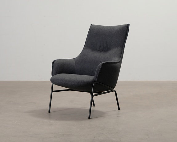 Swedesen Glove-nojatuoli sinisellä kangasverhoilulla ja mustalla rungolla. Glove on Edward Barberin ja Jay Osgerbyn suunnittelema. Persoonallinen tuoli tarjoaa erinomaista istuinmukavuutta ja se sopii erityisesti toimistoihin ja julkisiin tiloihin, mutta myös yksityiskoteihin.