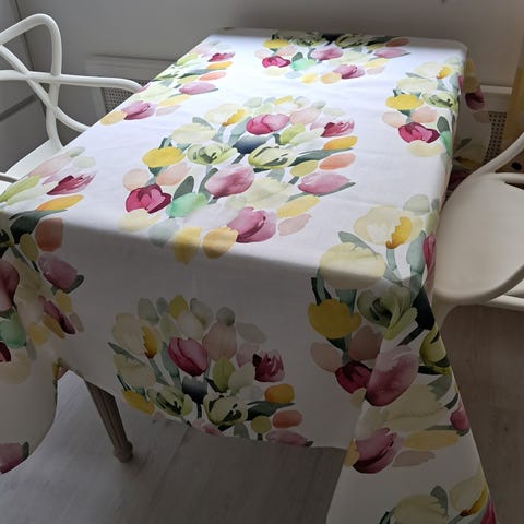 Pöytäliina on käytetty, mutta se on puhdas ja ehjä.