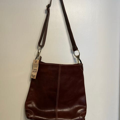 Uudenveroinen nahkalaukku tummanruskeaa nahkaa. Koko 37x25x10cm. Normikokoinen läppäri mahtuu laukkuun.