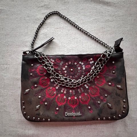 Desiqualin kaunis pikkulaukku Mitat 30 x 27 cm. Keinonahka/kangas. Kolmea sisätaskulla. Kevyt, siisti,olkahihn. Lähes käyttämätön
