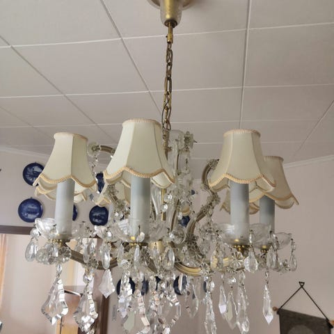 Kattokruunu, jossa on koristeellisia kristalleja ja kullan värinen runko. Sopii erinomaisesti olohuoneeseen tai ruokailutilaan luomaan eleganttia ilmettä. Valaisimessa on 5 lamppuja, jotka antavat hyvän valaistuksen. Korkeus 75 cm, leveys 55 cm. Rosetin saa halutessaan kaupan päälle.