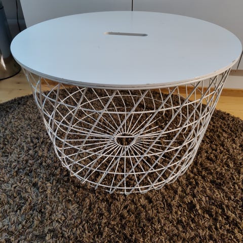 Kaksikerroksinen maitolasinen sohvapöytä metallirungolla. Halkaisija n. 60cm ja korkeus n. 45cm.