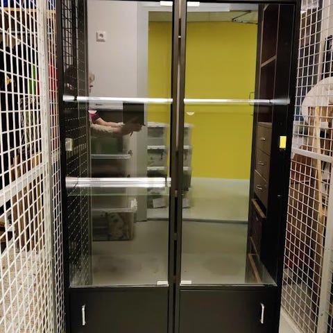 Luonnonvaalea vitriini, annetaan pois tarpeettomana. Alalaatikon nupit ja kiskot vaativat kunnostusta, mutta muuten täysin toimiva ja siisti.
