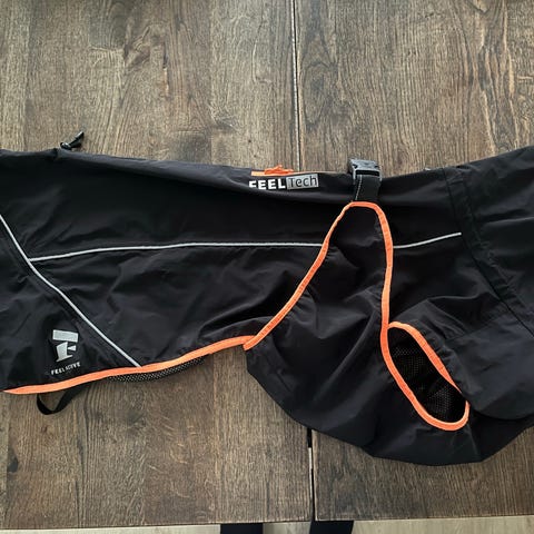 Suojaa hyvin koiraa, Sadetakki verkkovuorella, jalkalenkit, kaulassa säätö samoin pituus säädettävissä, selässä vedenpitänä kaksisuuntainrn vetoketju. Teipatut saumat