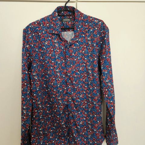Tummansininen, jossa valkeita kuvioita. Lyhyet hihat.