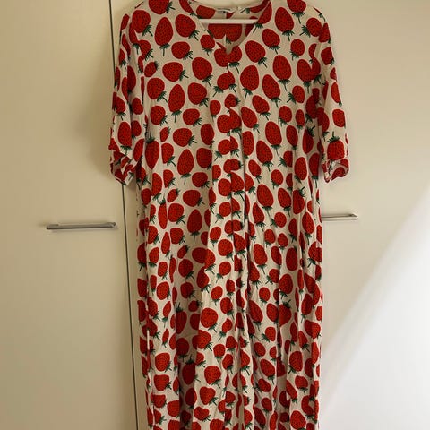 Marimekko Lennellä Mansikka -mekko. Koko 42 mutta on pieni, enemmän kokoa 40. Kai-kai 46 cm, olka-helma 130 cm. Kuuluu olla ryppynen. Mukana pussukka.