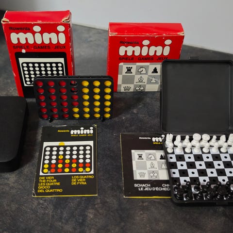 Vanha matkapeli lokerossaan. Kuoret viininpunaista pahvia. Lauta puuta. Laudan päällä shakkiruudut. 8 x 8 eli 64 ruutua . Sisällä pahvinen vetolaatikko, josta toinen pääty irronnut. Vaaleita ja punaisia nappuloita, joista punaiset 4 kpl, nappulan nuppi irti ja valkeat 10 kpl. Nappuloita siis puuttuu punaisista 8 ja valkeista 2 kpl. Mutta niitähän voi tehdä lisää. Päällä kaunokirjaimin teksti Checkers. Koko 12 x 20 cm, kork. 2,5 cm. Tosi vanha peli. Postitus tai nouto.