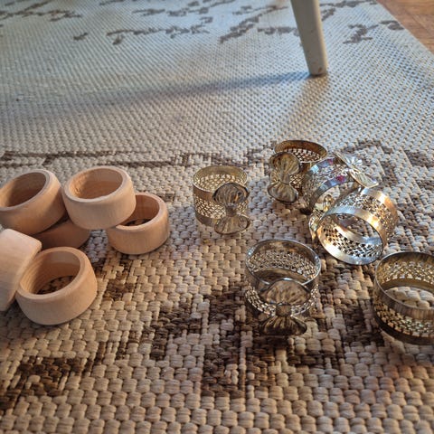 Kattaukseen neljä valkoista, kaunista pellavaservettiä (43*46 cm) rengastettuna neljällä hopeisella servettirenkaalla, joissa K-kirjain. Käyttämättömät.