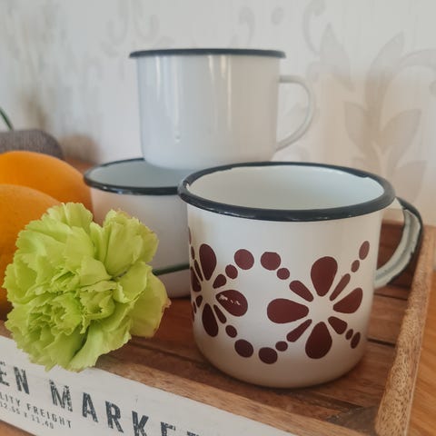 Myydään kauniit vanhat ajan patinoimat emalimukit. Myydään settinä. Postitus onnistuu. Ostaja maksaa postikulut.