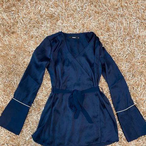 3. Tyylikäs tummansinisellä pohjalla kukkia, Sinsey, S tai 36, edessä solmittavat tummansiniset nauhat, hihoissa ja helmassa kuminauharesorit, 4 eur