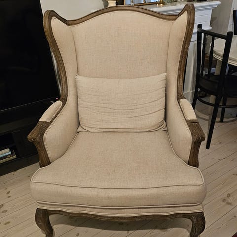 Myynnissä kaksi rokokoo tyylistä tuolia. Istuintyynyssä vetoketjulla irrotettava päällinen. Kankaan värinä tumma marjapuuro. Tukevat ja oikein mukavat istua.