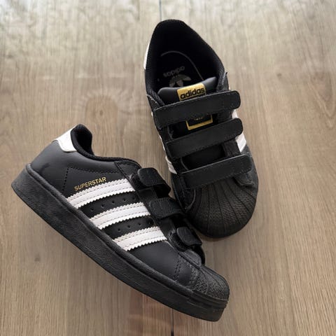Adidaksen superstar -tennarit. Koko 30. Melko hyvässä kunnossa, lähinnä pientä likaa sivuilla eli käytönjälkiä. Aina olleet ”parempina” kenkiä eli ei pihaleikeissä ränsistyneet. Täysin ehjät.