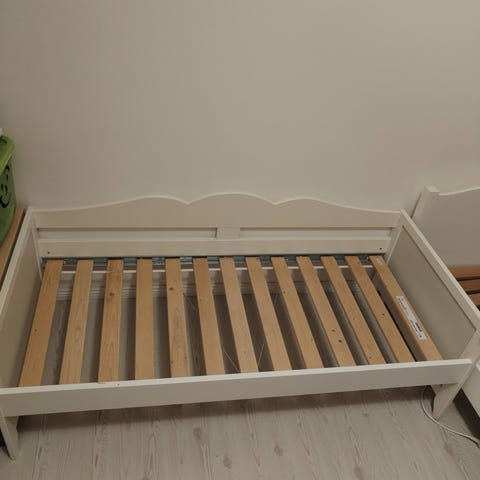 IKEA Hensvik 160x70 cm lastensänky + siisti patja + patjansuojus (+ IKEAn turvakaiteita 5€/kpl; ei kuvissa). Sänky on helppo kuljettaa osissa, mutta voin myös kasata sen. Jonkin verran pintakolhuja (ks. kuvat) ja jälkiä lasten eläintarroista. Säilytetty aina sisätiloissa, ei lemmikkieläimiä. Uutena IKEAssa noin 200€.