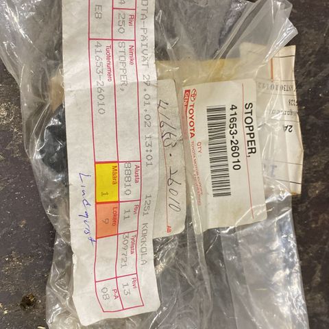 Myydään Toyotan uusi ja alkuperäinen osa, osanumero 69401-26021 (STOPPER, BACK DOOR SIDE MALE, RH), Pysäytin luukun sivulla). Näitä löytyy kaksi kappaletta, hinta yhdelle kappaleelle. Sopivuus:
