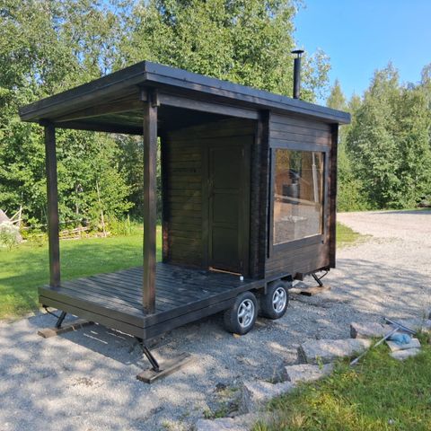 Myydään kärrysauna pukuhuoneella + kuisti. Pituus 4.50 m, leveys 2.10 m.