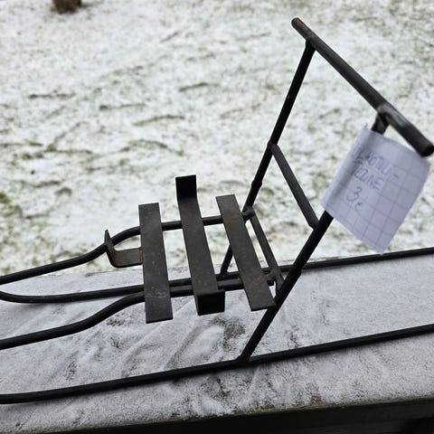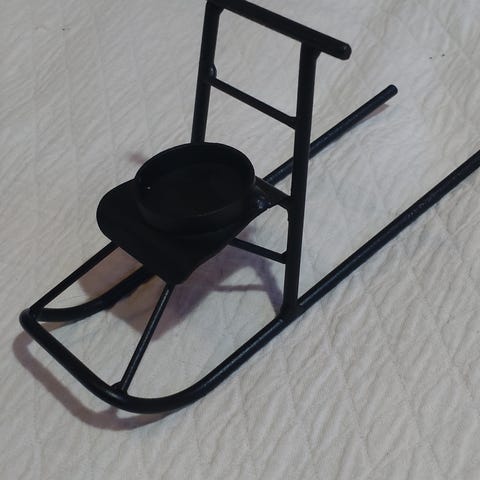 Rautaa oleva Eslan potkukelkka kynttilän tai kukkakoristeen voi laittaa istuimelle.