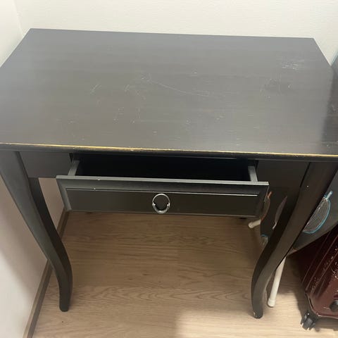 Pieni Union Jack pöytä. Käytetty sohvapöytänä. Tässä on kolme pientä kolhua. Muuten ei valittamista ja nuo saisi helposti korjattua, jos olisi viitsinyt. Ei kuitenkaan sovi enää omaan kotiin niin annetaan eteenpäin.
