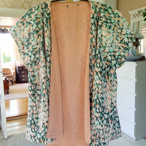 Kitinvärinen jakku. Ei kiinnitystä. 70% puuvillaa, 30% polyesteriä. Kauniisti kuvioitu.