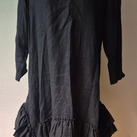 BYPIAS merkin Ruffle and pearl pellavamekko. Näyttävä pellavamekko muhkean frillatulla helmalla. Malli on a-linjainen. Pituus olalta helmaan 88 cm & rinnanympärys 105 cm.
