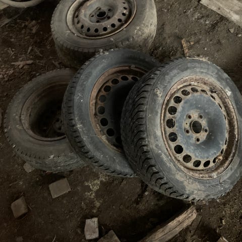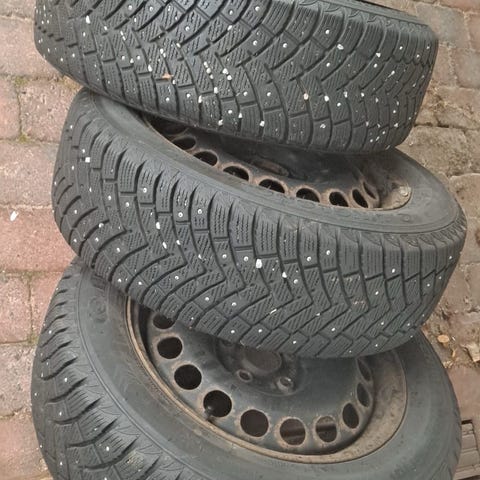 2 kpl kohtuullisia Volkswagen Passatissa alla olleita nastarenkaita ruosteisilla peltivanteilla. Toinen rengas on vasemman puolen ja toinen oikean puolen rengas.