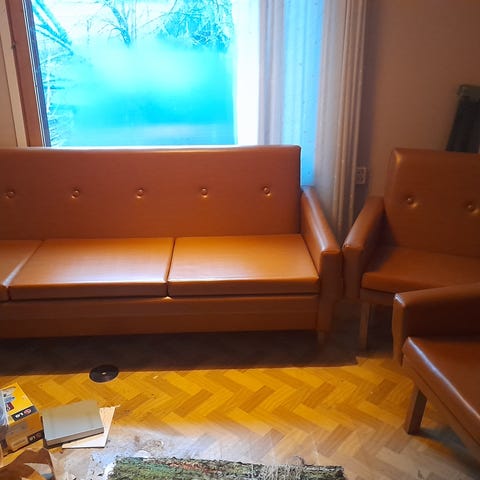 Ostan kuvanmukaisen sohvaryhmän eli sohvan ja kaksi samaan sarjaan kuuluvaa nojatuolia. Myös muut värit huomioidaan. Tarjoa vain ehjää ja homeetonta.
