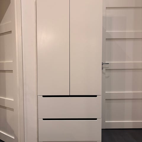 Kokoamisohje: https://manuall.fi/ikea-ps-vaatekaappi/. Helppo koota ja purkaa. Kuvassa koottuna näkyy tummempi musta, muissa oikea väri. Musta väri on hiukan haalistunut useassa pesussa. Postitus (23e), tuonti (Helsinki, 10e) tai haku.