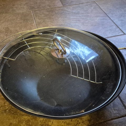 Aito aasialaien käsintehty suurikokoinen (halkaisija 40 cm, korkeus 14 cm) mutta kevyt wok pannu - käytetty avotulella (pohjassa hiukan ruostetta, mutta se lähtee pois hankaamalla)
