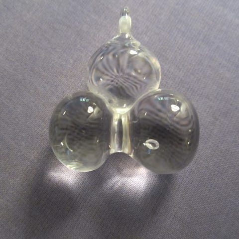Korussa on kolme kaksisenttistä lasipalloa, nauha on nahkaa ja sen pituus 80cm