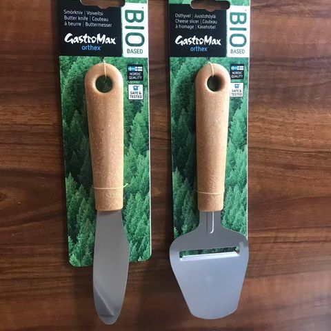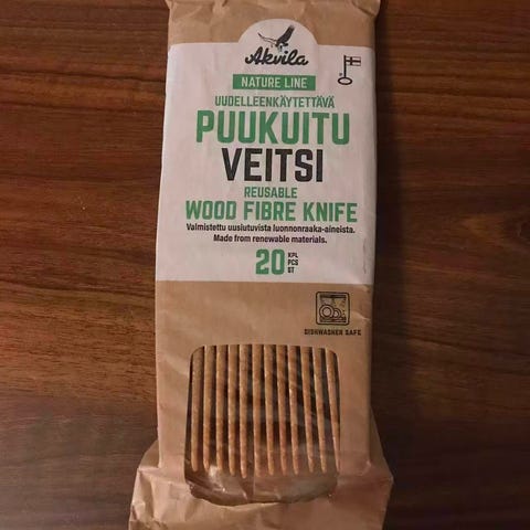 Valmistettu biomuovista. Taipuisa teräosa on ruostumatonta terästä. Sahalaitainen terä leikkaamiseen. Kädensija valmistettu biopohjaisesta muovista, yhdistelmä sokeriruokoa ja pohjoismaista puukuitua.