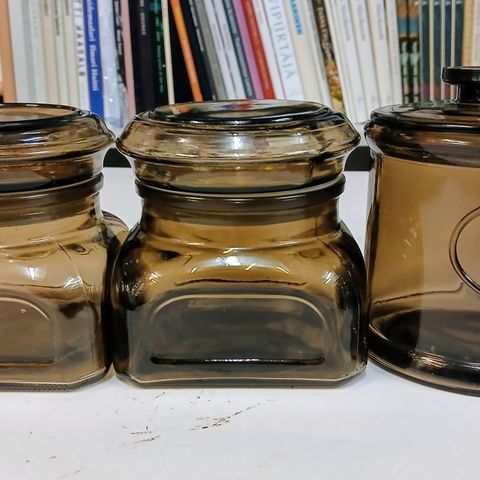 Riihimäen lasi, Ole Plsby, Scala lasipurkki 2kpl, pohjassa teksti Riihimäen Lasi FINLAND Design Ole Palsby ja Ilves logo, mittoja korkeus ilman kantta n.15cm halkaisija n.9,5cm vetoisuus n.3/4l