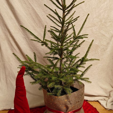 Suureksi kasvanut huonekuusi avarampiin valoisempiin tiloihin. Korkeutta hällä mullan rajasta n. 138cm. Yli 170cm roskapöntön, hänen ruukkunsa kanssa. Tarvitsee valoa, mutta ei paahdetta.Tuo ruukku olisi hyvä olla reijitetty. Kahdella kantajalla mielellään.