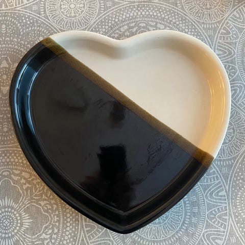 Noin 30 cm levyinen ja 4 cm korkea sydämenmuotoinen tarjoiluvuoka (Kermansavi Heinä). Täysin ehjä, mutta sisäpinnassa on pari pinnoitetahraa, joista ei käytöllistä haittaa.