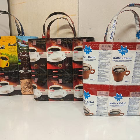 Hienoja erilaisia kahvikasseja on tehty siksak tyylillä ja on tosi mahtava. Helposti ei tule toista samanlaista vastaan. Mitat korkeus36, pohjan leveys22 ja pohjan pituus33.Teen uusia koko ajan jotta jos kiinnostuit niin lähetän kyllä kuvia Lähetys onnistuu itse tekemään pakettiin koska kassia ei voi taitella.pienet kahvikassit samalla tyylillä tehty isojen kassien kanssa.pikku kassin pohja mitat 17 ja 22 korkeus 18.pikku kassin hinta 25,-