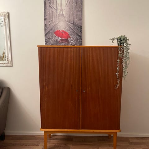 Tiikkiviilua, säännöllisesti öljytty. Moitteena kaapin päällä takaosassa pieni viilun halkeama, jää lähes näkymättömiin.