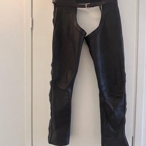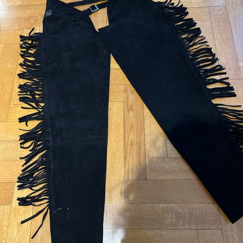 Mokkanahkaiset kokochapsit hapsuilla. Lahkeen pituus 70 cm.
