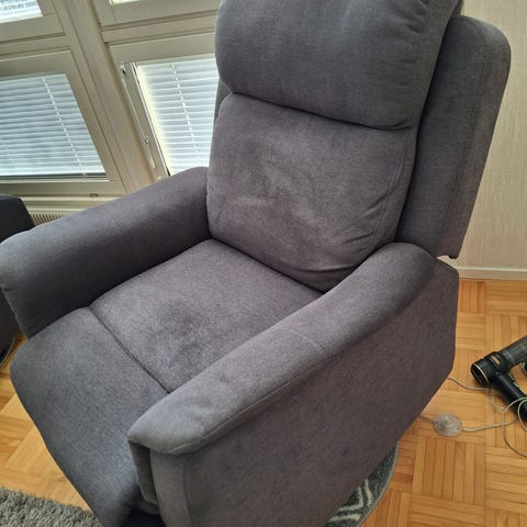 Lounge-tuoli jauhemaalattua metallia, matalat käsinojat. Sopii myös erinomaisesti parvekkeelle tai terassille. Kokonaissyvyys noin 70 cm, kokonaisleveys noin 63 cm, kokonaiskorkeus n. 70 cm. Istuinkorkeus 40 cm. Toisen jalkaosan lattiaa vasten tuleva muovinen toppari oli hajalla jo tuolin toimitusvaiheessa ja korvattu erillisellä pehmusteosalla (ks. kuva).