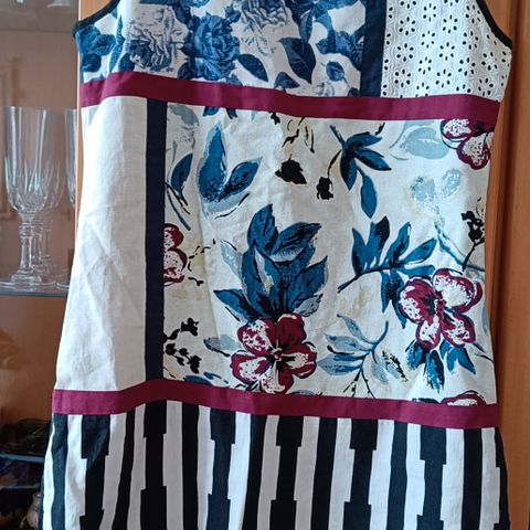 Raidallinen pellava-puuvillamekko M-koossa. Mitat: kai-kai 55, olka-helma 91. Materiaali: 54% pellavaa, 46% puuvillaa.