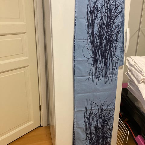 Maija Isolan suunnittelema Heinä, 1957. Tehty verhoksi. Molemmissa päissä 10 cm käänteet. Vain käteiskauppa tai toridiili.