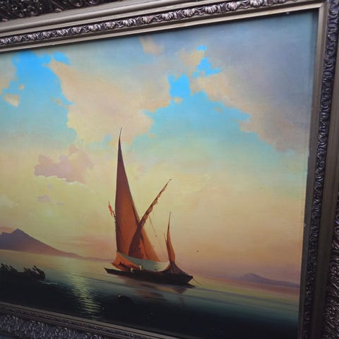 Tuntematon taiteilija maalaus, joka esittää purjelaivaa merellä. Maalauksen värit ovat pääasiassa tummanpunaisia ja mustia, luoden dramaattisen tunnelman. Sopii hyvin sisustuselementiksi esimerkiksi olohuoneeseen tai toimistoon.