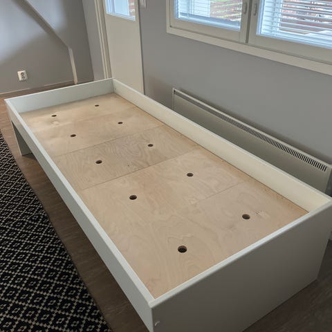 Sängynrungot ovat nyt valmiiksi purettuna osiin kuljetusta varten. Kaikki ruuvit tallessa ja saat mukaan; helppo koota sängyksi uudelleen.