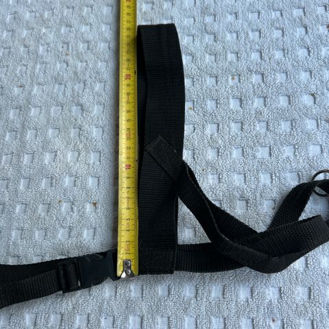 Musta-punaiset nylonista tehdyt koiran valjaat. Rinnanympärys max 75 cm. Kaula maximissaan noin 43cm