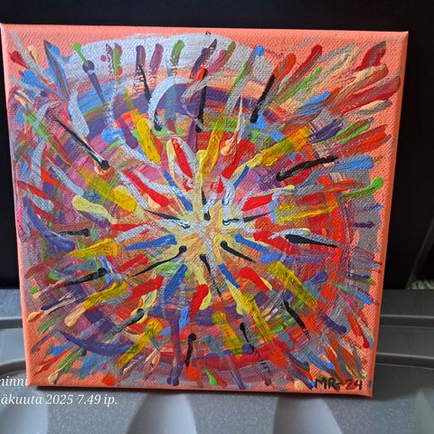Abstrakti taideteos, jossa on värikäs spiraalikuvio. Teos on maalattu kankaalle ja siinä on käytetty useita värejä, kuten punainen, sininen ja keltainen. Sopii moderniin sisustukseen ja tuo eloa huoneeseen.