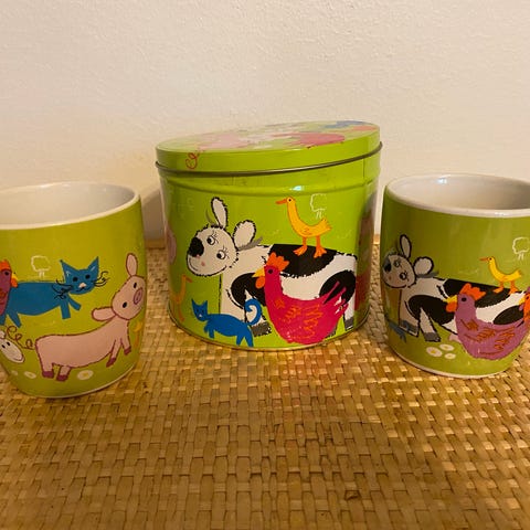 Ostan kuvan mukaisia mintunvihreitä / turkooseja (?) Ernesto-merkin peltipurkkeja. K. n. 20 cm, l. n.16 cm.
