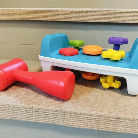 Fisher-Price hakka on kaksipuoleinen muovinen lelu, jossa lapsi saa lyötyä vasaralla lelussa olevia värikkäitä paloja penkin läpi. Ikä 12 kk +.